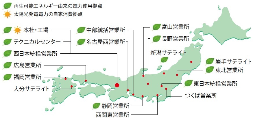 2022年4月より、再生可能エネルギー由来の電力購入と太陽光発電電力の自家消費により、国内で消費する電力の99%以上を再生可能エネルギー化しています。国内全拠点での年間電力総使用量は約240万kWhであり、再生可能エネルギー化により年間約800t-CO2eの排出量削減となります。