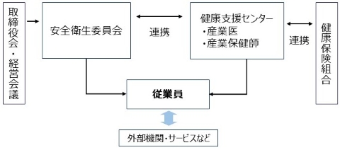 従業員が心身ともに健康で活き活きと働き、ひいては生産性が向上することを目的に、各部署で連携し各種活動や環境づくりに取り組んでいます。また、定期的に経営トップと産業医(健康支援センター長)との協議の場を設け、健康支援センターが安全衛生委員会と連携し、各種取組みの実施やサポート体制を構築しています。